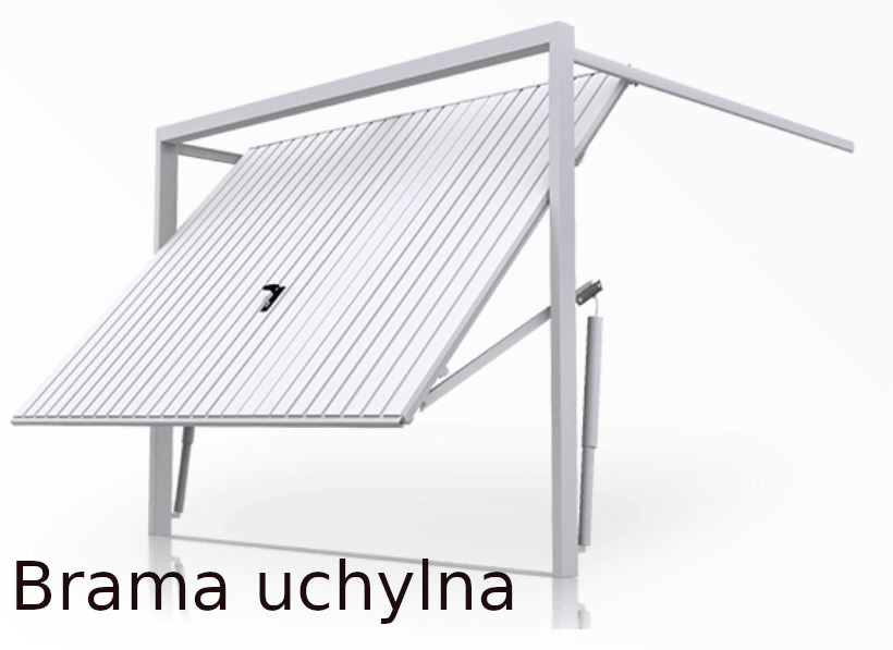 - uchylne - brama w postaci monolitycznej połaci wykonanej z blachy ocynkowanej trapezowej t-10. Układ blachy może być pionowy lub poziomy czy skośny. Brama może występować również z ociepleniem. Brama unoszona za pomocą sprężyn w całości wykłada się na prowadnicach poziomych.